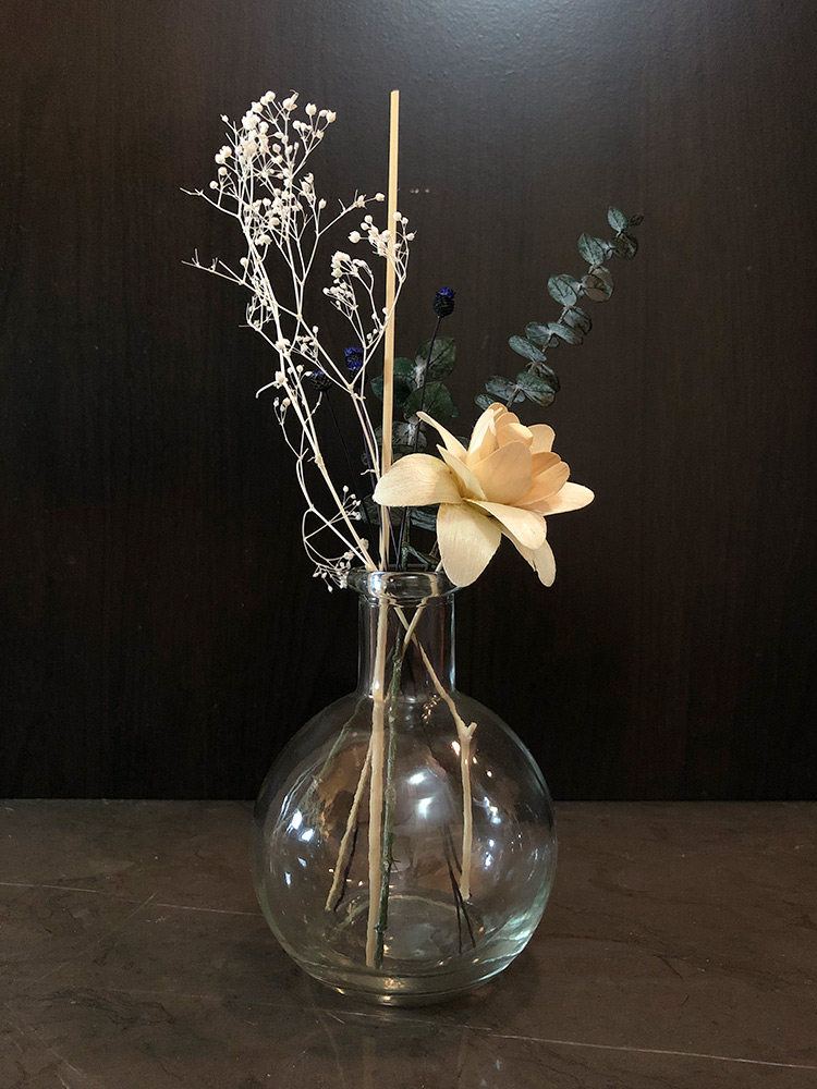 Essential oil diffusers crafted with naturally preserved botanicals & found vintage glass and hardware.